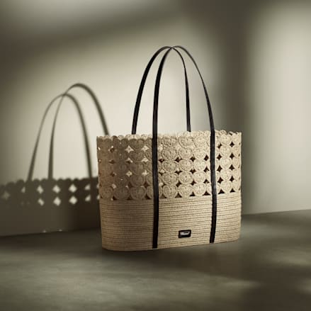 A chic, natural look for this raffia tote bag with black leather handles that you'll love as soon as the first rays of sunshine appear. Like all accessories in the Happy Hearts line, its upper section features small openworked braided hearts. A dainty piece of entirely hand-crafted fine workmanship making each piece unique. Perfect for the beach, a stroll, a shopping trip or lunch in town, its summery charms shine wherever you take it.Unquestionably the must-have bag for the summer season!