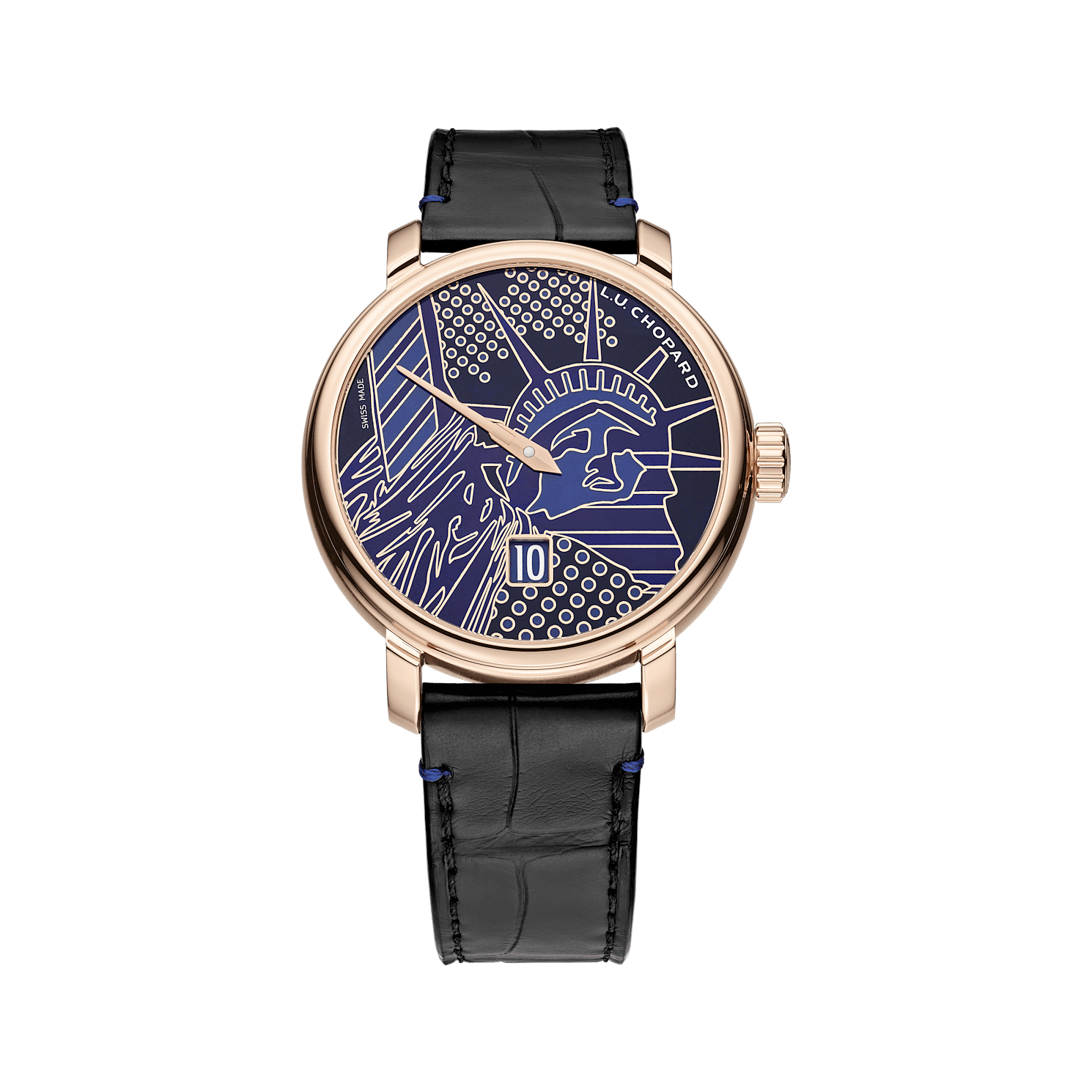 To mark the inauguration of the Chopard New York boutique in the Crown Building on Fifth Avenue, Chopard is presenting a special edition of its jumping hour watch: the L.U.C Quattro Spirit 25 New York Edition. Its innovative, ultra-sophisticated L.U.C 98.06-L movement is housed in an ethical 18-carat rose gold case measuring 40 millimeters in diameter, with the minimalist lines characteristic of the L.U.C. collection. The four barrels of the exclusive Chopard Quattro technology allowing for up to eight days of power reserve make the L.U.C Quattro Spirit 25 one of the rare jumping-hour watches with such autonomy. On the blue dial in grand feu enamel, Chopard Manufacture's enameling craftsman has reinterpreted the legendary Statue of Liberty in a pop art-inspired design. From the movement to the dial, the entirety of this unique timepiece, available exclusively in the new Chopard New York boutique, is made in-house using the skills of the Manufacture's craftsmen, ensuring a high degree of finishing that has been awarded the prestigious Poinçon de Genève.